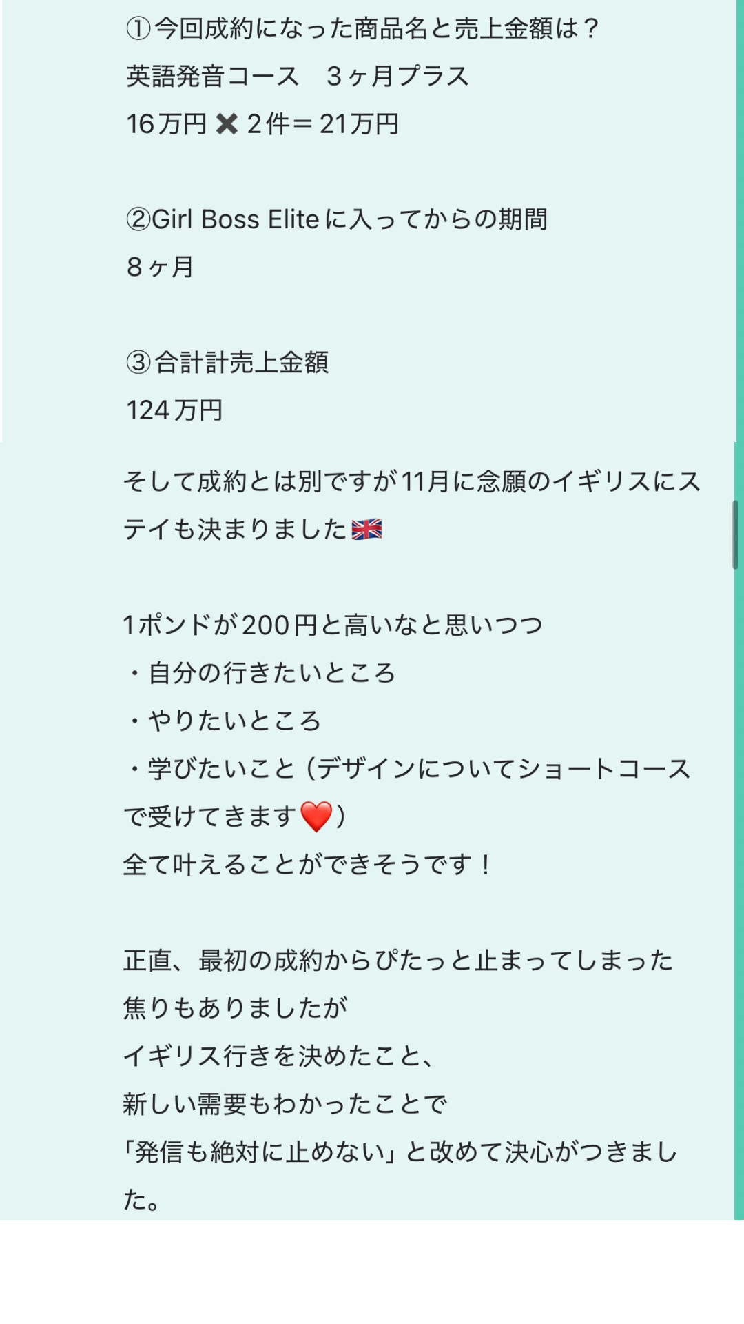 幸せな人たちを増やす活動をしていきたいのに、ビジネスに対しての苦手意識があり、継続させていく方法が分からず、やっては諦めを繰り返していました。当時は「結局何も出来ないし続かない」とモヤモヤする毎日で苦しかったです。GIRL BOSS ELITEに入り、「私にも出来る!私にしか伝えられない事がある!」という自信を持てるようになりました。売り上げは1ヶ月目で50万を達成することができ、成約率65%を超える結果となりました。同時に、お客様に感謝をされた事がとても嬉しくて、この仕事をしている自分に誇りが持てました。場所や時間に捉われない生活をしたいという、理想のライフスタイルが叶う可能性が大きくなったと感じました!私のシェアによって新たにMisakiさんの元へ導かれる人が増えて愛とお金の循環が更に拡大していく事が楽しみです。